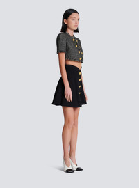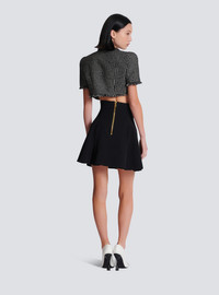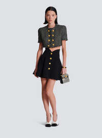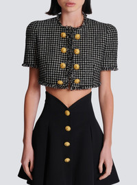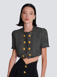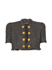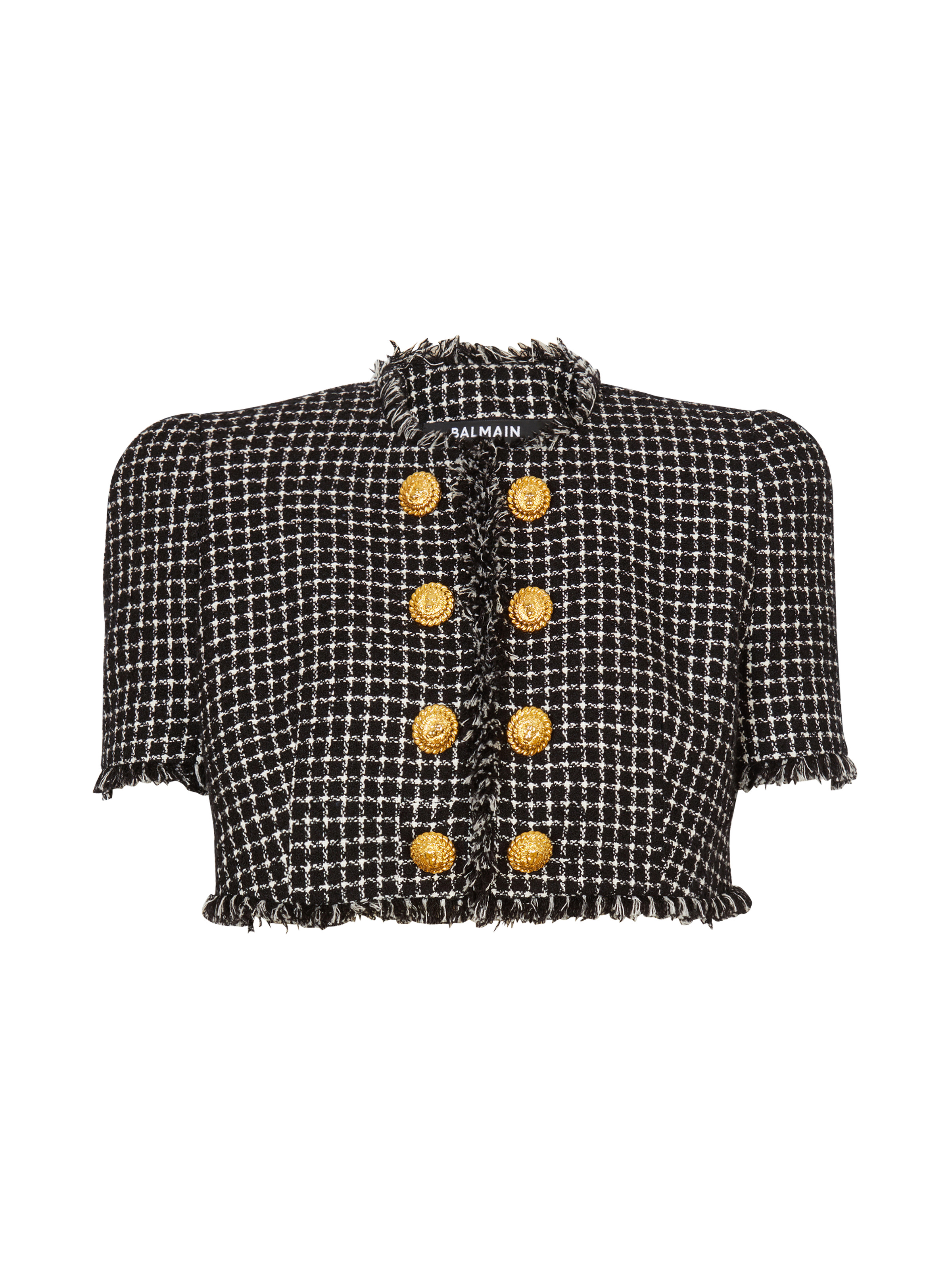 Gingham tweed jacket - Cropped, tight fit - Structured shoulders - Short sleeves - Round neck - Edge-to-edge fastening with 4 invisible hooks - 4 decorative "Double Chain Lion" buttons in gold metal - Frayed finishes - Twill lining - Model measures 175cm and wears a size 36 - Main material: 86% cotton 14% polyamide - Made in Poland - Item: CF0SD180CF02