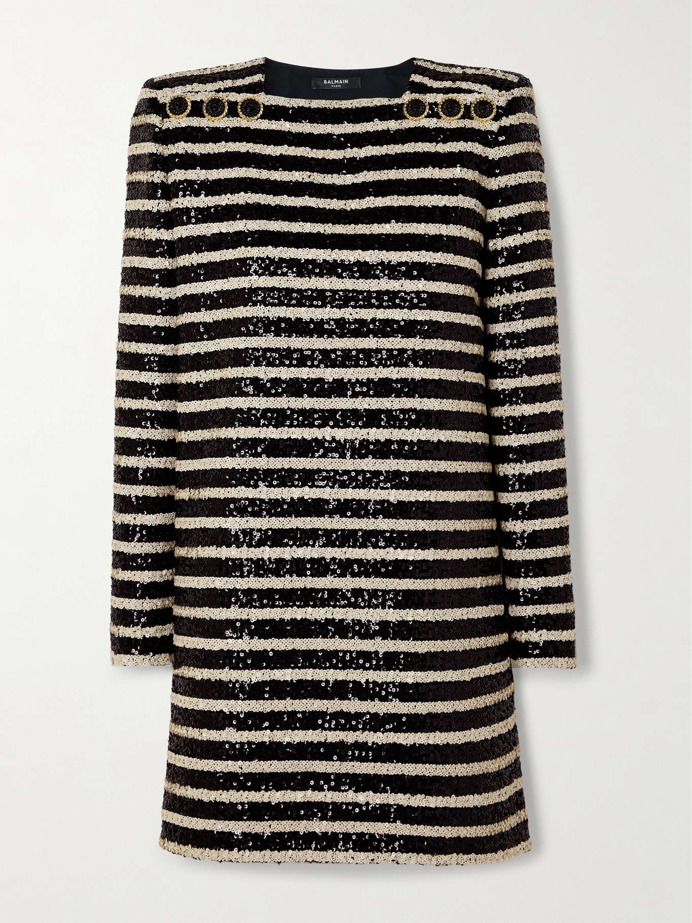 EDITORS'NOTES Balmain's dress taps into nautical style with a sequined twist. Designed on a tulle base, it's shimmering in stripes and has the brand's structured shoulders. The boxy cut is refined with decorative lionhead buttons. SIZE & FIT Model measurements: - Fits true to size, take your normal size - Designed for a slim fit - Internal shoulder pads - Mid-weight, heavily embellished, non-stretchy fabric - Model is 180cm/ 5'11" and is wearing a FR 36 - Bust: 81cm/ 32” - Waist: 65cm/ 25.5” - Hip: 90cm/ 35.5” DETAILS & CARE - Black and white sequined tulle - Concealed zip fastening at side, snap fastenings at shoulders - Fabric1: 100% polyester; fabric2: 77% acetate, 23% viscose - Dry clean