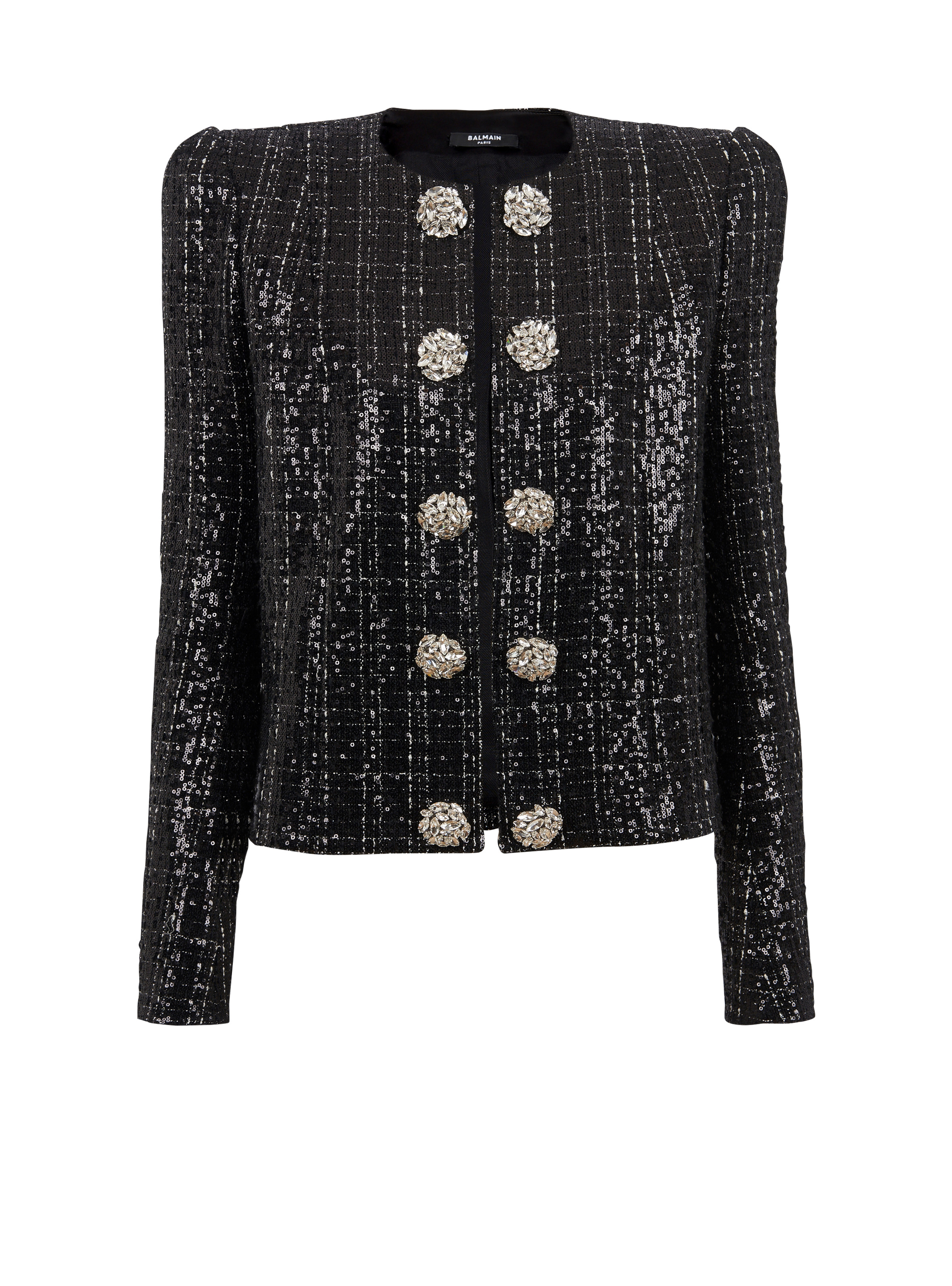 Sequin-embroidered tweed jacket - Straight short cut - Round neck, collarless - Structured shoulders, long sleeves - Edge-to-edge fastening with 8 crystal jewelled buttons - Model measures 180cm and wears a size 36 - Main material: 100% polyester - Made in Poland - Item: CF1SK449XI07