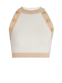 Gold-trimmed knit crop top - Sleeveless - round neck - embossed gold buttons - Tight fit - This item fits true to size (select your usual size) - The model is wearing a size S - The model's height is 177 cm - Material: 83% viscose, 17% polyester - Made in Italy - Item: AF1AB022KD74