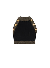 Gold-trimmed knit crop top Sleeveless, round neck, embossed gold buttons Tight fit This item fits true to size (select your usual size) The model is wearing a size S The model's height is 177 cm/5 ft 9 in, bust 81 cm/32 in, waist 58 cm/23 in and hips 89 cm/35 in Made in Italy Material: 83% viscose, 17% polyester Item: AF1AB022KD74