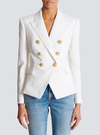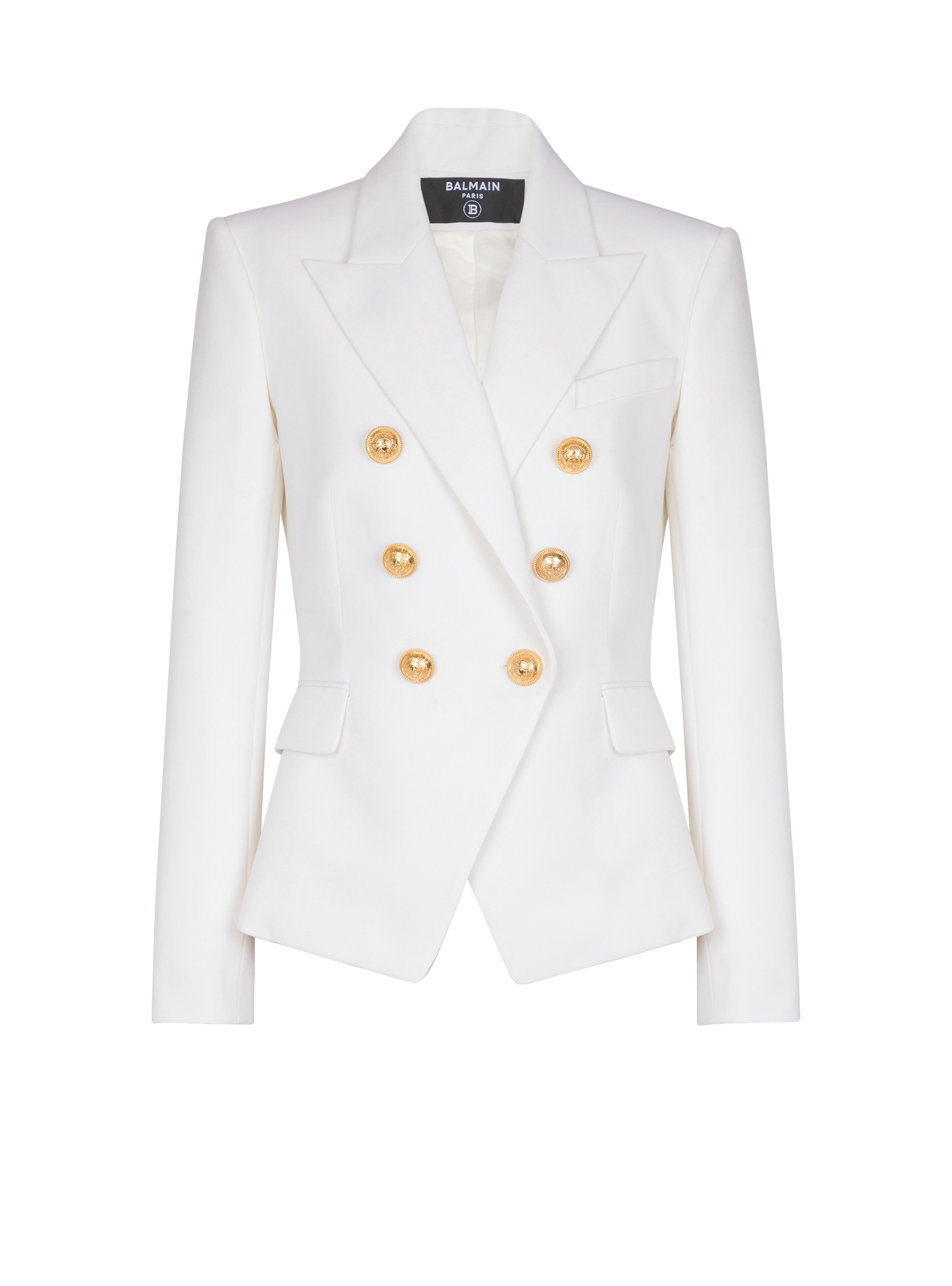 Grain de poudre 6-button jacket - Tailored cut with a fitted waist - Italian tailored collar - Structured shoulders - Long sleeves - Straight cuffs with 5 buttons - 6 buttons on the front, 5 of which are decorative - Double-breasted fastening with hidden engraved horn button on the inside - "Double Chain Lion" buttons in gold metal - Breast pocket - 2 side slash pockets with flaps - Inside pocket - Twill lining - Model measures 178cm and wears a size 36 - Main material: 100% virgin wool - Made in Slovakia - Item: EF1SG009WC09100% of the wool fibres used to make this garment are sourced from sheep farms that are certified and animal welfare-friendly