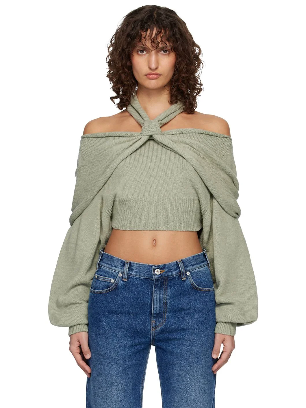 Knit silk sweater. · Modified off-the-shoulder construction · Halter strap at straight neck · Rib-knit cuffs and hem · Logo patch at back collar · Draped panel at back Supplier color: Sage 100% silk. Made in Italy 261251F096002
