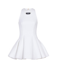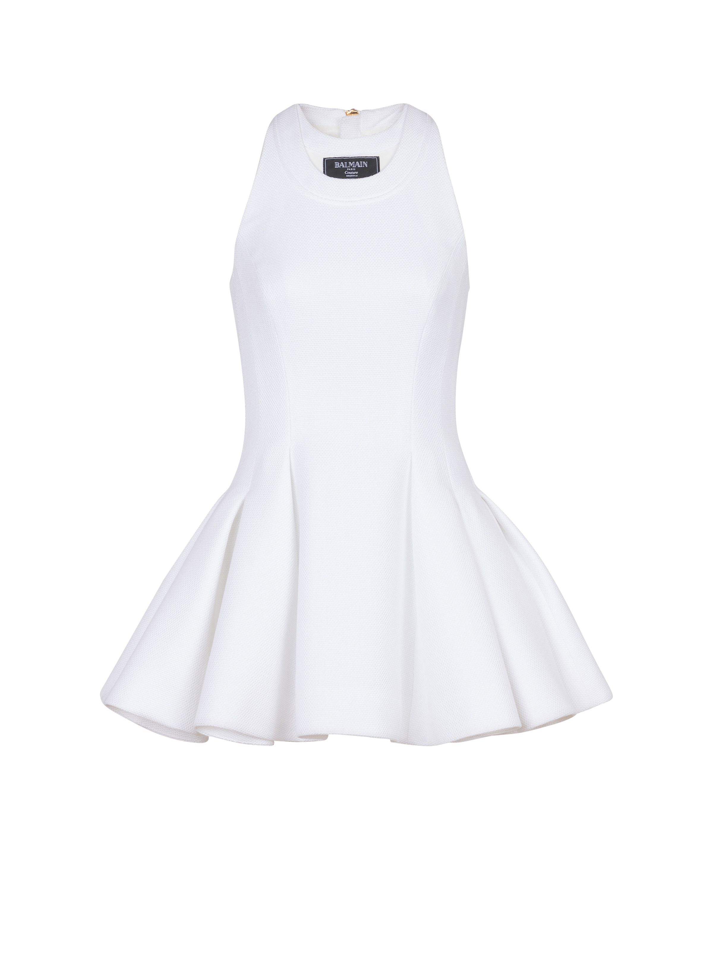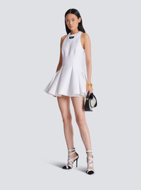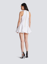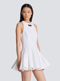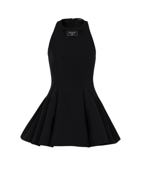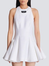 Flared pleated dress - Halter neckline - Double neckline effect - Woven Balmain Couture label on the front - Sleeveless - Visible golden metal zip fastening on the back with Balmain Paris-engraved slider - Twill lining - Short A-line cut - Model measures 179cm and wears a size 36 - Main material: 98% viscose 2% polyamide - Made in Poland - Item: EF1R5087MG61