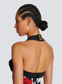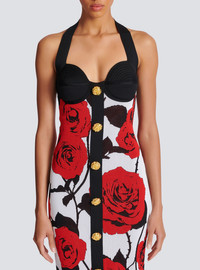 Halterneck dress in Red Roses jacquard knit - Tight midi fit - Halterneck - Sweetheart neckline - Structured bustier - 9 decorative "Roses" buttons in gold metal - Fastening at the neck with 4 "Double Chain Lion" press studs in gold metal - Visible double metal zip fastening on the back with Balmain Paris-engraved slider - Contrasting ribbed edging - Model measures 179cm and wears a size 36 - Main material: 76% viscose 24% polyamide - Made in France - Item: CF0RJ013KG31100% of the viscose fibers in this garment come from sustainably managed forests and certified