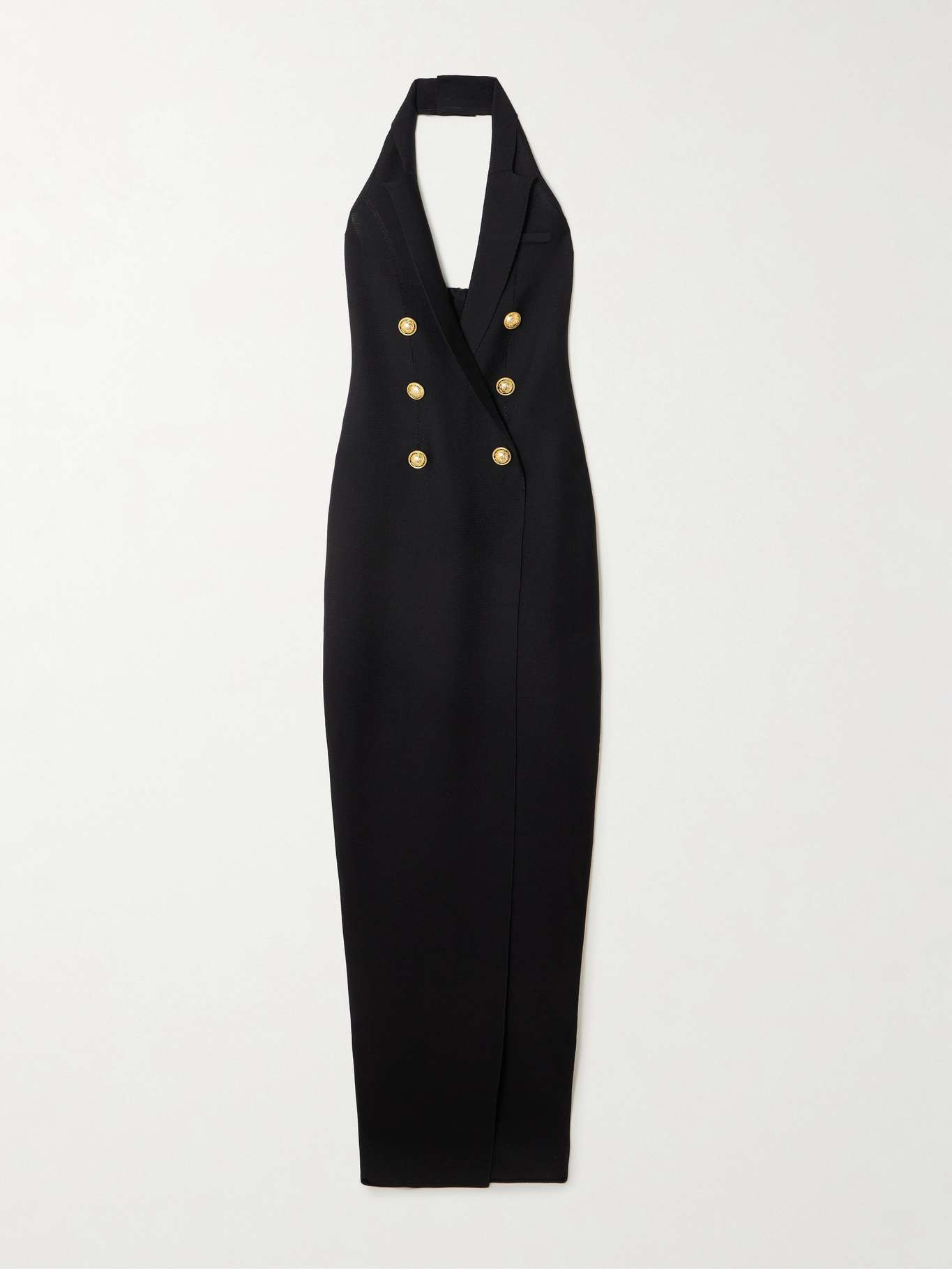 EDITORS'NOTES Balmain's signature gold-tone buttons are a symbol of power and Parisian glamour - a closer look at the ones decorating this maxi dress reveals the intricate crest and logo engravings. It's knitted for a slim fit and has a tailoring-inspired design with peak lapels at the halter neckline. The split hem showcases plenty of leg as you walk. SIZE & FIT Model measurements: - Fits true to size, take your normal size - Those with curvy hips may wish to take the next size up - Designed for a close fit - Mid-weight knit - Model is 180cm/ 5'11" and is wearing a FR 36 - Bust: 80cm/ 31.5" - Waist: 65cm/ 25.5" - Hip: 89cm/ 35" DETAILS & CARE - Black stretch-viscose - Concealed zip fastening along side - Unlined - 98% viscose, 2% elastane - Dry clean
