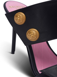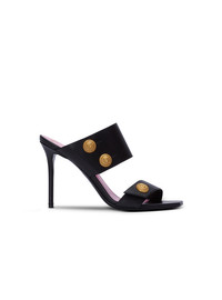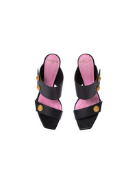 Heeled Eva mules in calfskin - Open square toe - Straps with decorative gold metal "Lion Head" buttons - Leather-covered stiletto heel - Leather outsole - Contrasting leather insole embossed with a grid motif - Leather lining - Heel height: 9.5 cm - Main material: 100% calfskin leather - Made in Italy - Item: CN0UR007LVIT