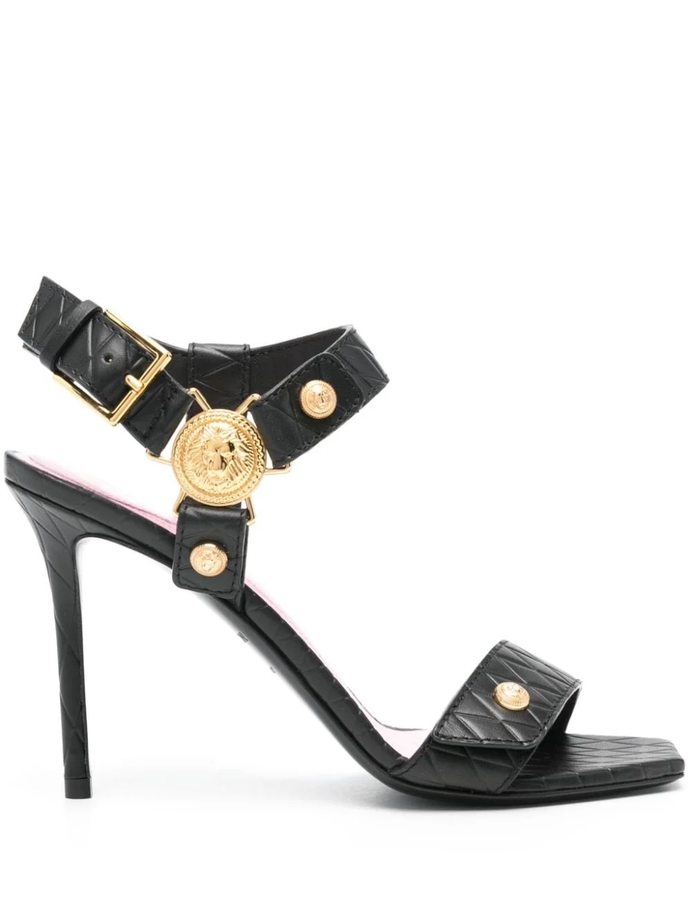 100mm leather sandals Highlights - Black - Calf leather - Smooth grain - Square open toe - Diamond quilting - Single toe strap - Branded leather insole - Leather sole - 100mm stiletto heel - Gold-tone hardware with lion head motif - Buckle-fastening ankle strap Made in Italy Composition Sole: Calf Leather 100% Outer: Calf Leather 100% Lining: Calf Leather 100% SIZE & FIT Measurement HEEL 3.74 in(9.5 cm)