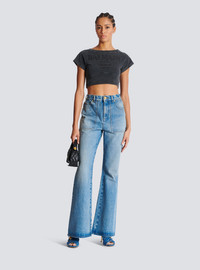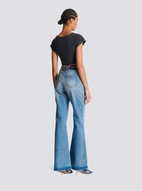 Flared blue denim jeans - Waistband with belt loops and a triple belt loop at the back - Zip fastening with a gold metal button - Inverted pocket construction - 2 patch pockets on the front - 2 slash pockets on the back - Mini engraved Balmain Paris plaque in gold metal - High-waisted fit - Model measures 179cm and wears a size 36 - Main material: 100% cotton - Made in Romania - Item: EF1MJ115DF24