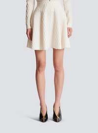 Flared crocodile-knit skirt - Elasticated waist - Visible zip fastening on the back with Balmain Paris-engraved slider - Raw hem - Flared cut - Model measures 178cm and wears a size 36 - Main material: 85% viscose 15% polyester - Made in Italy - Item: FF0LB923KJ03100% of the viscose fibres used to make this garment come from certified, sustainably managed forests