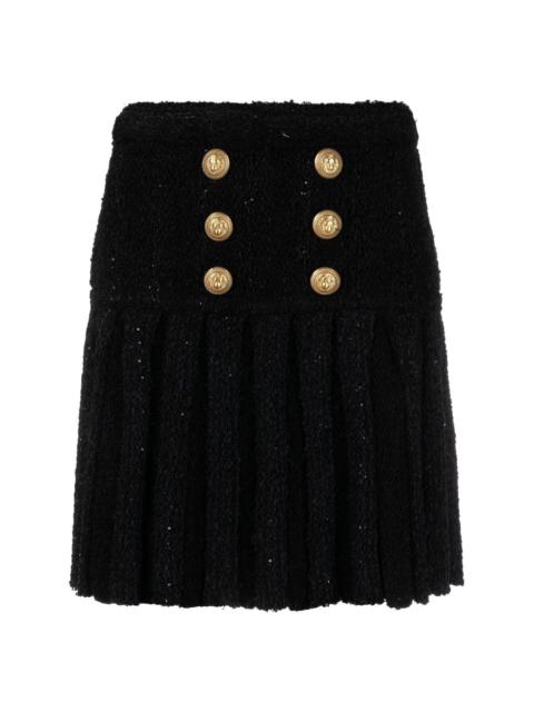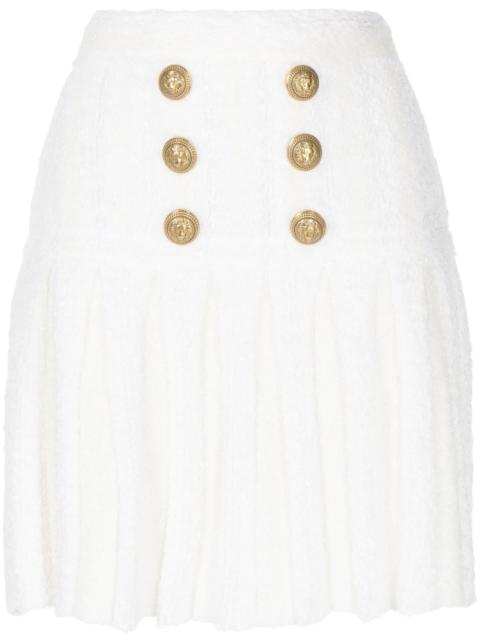 high-waisted button-detail skirt Balmain's opulent approach to tailoring is showcased on this SS23 collection skirt, which has a high-waisted silhouette and gold-tone button detailing. Highlights - Black - Cotton - High waist - Decorative button detailing Made in France Composition Hemp 32%, Viscose 30%, Polyamide 18%, Cotton 9%, Polyester 6%, Linen/Flax 5% SIZE & FIT Model measurements Height 5 ft 10 in(1.78 m) Bust/Chest 30.7 in(78 cm) Hips 34.64 in(88 cm) Waist 23.22 in(59 cm) FittingInformation This piece fits true to size. We recommend you get your regular size Designed to be fitted at the waist and hips, loose over the leg Made with a mid-weight fabric Washing instructions Dry Clean Only