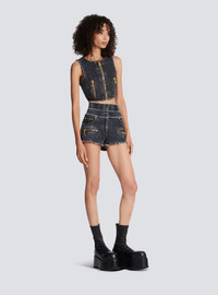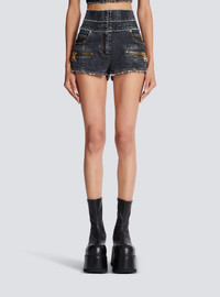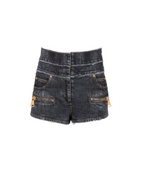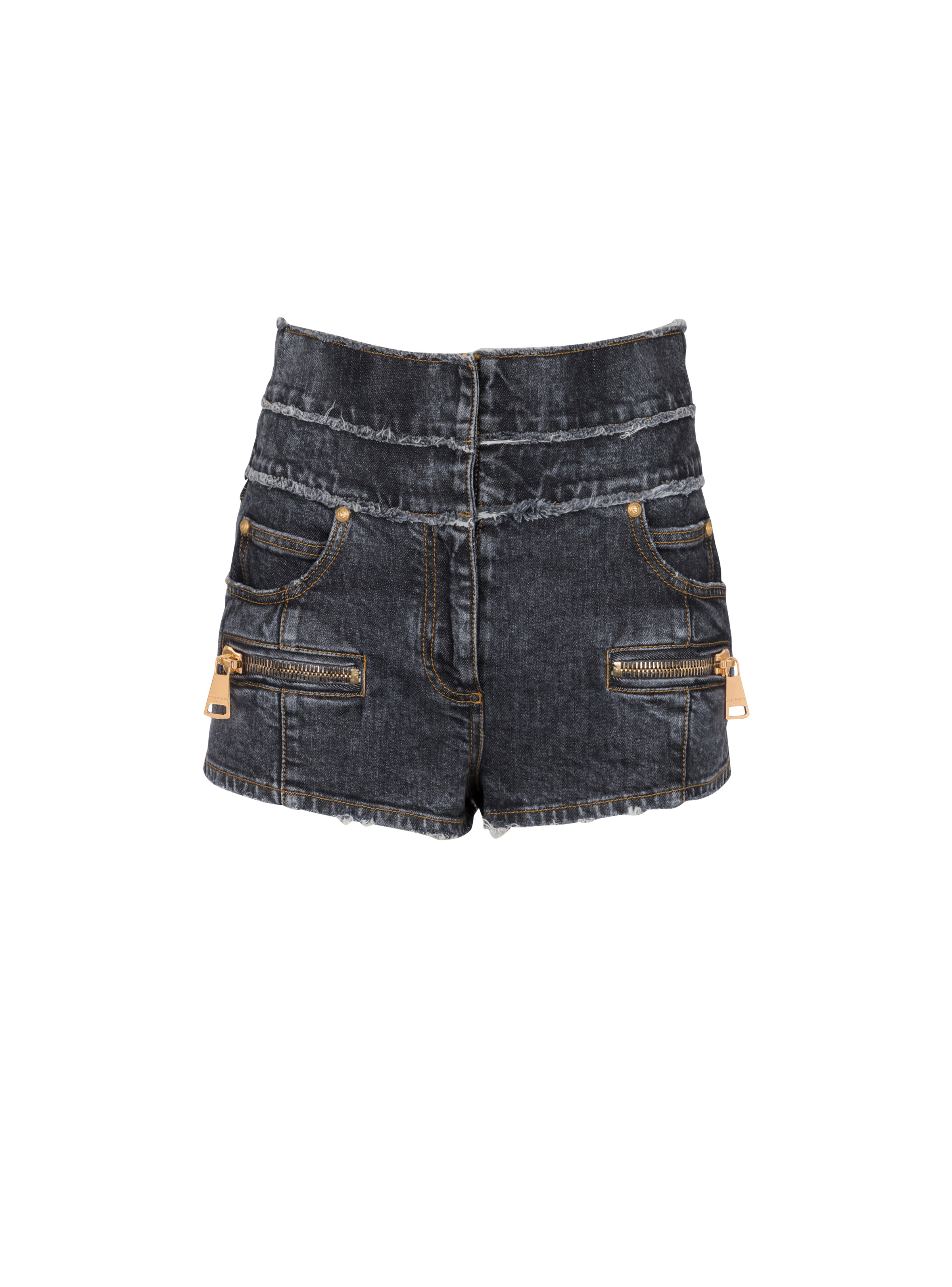 High-waisted faded denim mini-shorts Front zip fastening under placket, topstitched fly, topstitched vertical cut-outs on the front and back, slant and ticket pockets, zipped front pockets, gold-coloured XXL zips, patch pockets on the back, double frayed waistband, gold “lion head” embossed rivets Short slim fitThis item fits true to size (select your usual size) The model is wearing a size S The model's height is 177 cm/5 ft 9 in, bust 81 cm/32 in, waist 58 cm/23 in and hips 89 cm/35 in Made in ItalyMaterials: 98% cotton, 2% elastaneItem: AF1MA095DD10