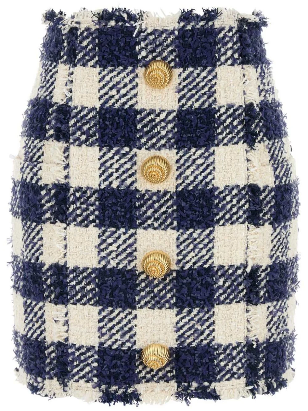tweed buttoned mini skirt Highlights - White/navy blue - Cotton blend - Tweed - Check pattern - Rear zip fastening - Frayed edge - Decorative button detailing - Straight hem - Thigh-length Made in France Composition Cotton 54%, Polyamide 27%, Polyester 12%, Acrylic 5%, Viscose 1%, other fibers 1% Washing instructions Read Manufacturer Guidelines