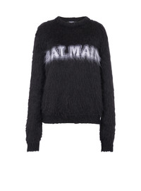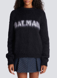 Jacquard brushed mohair jumper with contrasting Balmain on the front - Loose fit - Round neck - Long sleeves - Ribbed cuffs, waist and collar - Model measures 175cm and wears a size 36 - Material: 60% mohair, 25% polyamide, 11% virgin wool, 4% wool - Made in Italy - Item: BF0KD025KF38