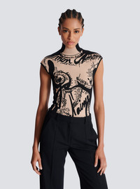Jacquard knit bodysuit with torso motif - High neck - Visible gold metal zip fastening on the back with Balmain-engraved slider - Press-stud fastening at the crotch - Fitted cut - Model measures 179cm and wears a size 36 - Main material: 97% viscose 3% polyamide - Made in France - Item: EF1BC025KH95100% of the viscose fibres used to make this garment come from certified, sustainably managed forests