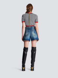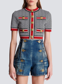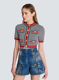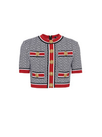 Jacquard crop top with contrasting monogram detail - Tight fit - Round neckline - Short sleeves - Decorative golden metal 'Lion Head' buttons on the front - 4 trompe l'oeil-effect pockets - Golden metal zip fastening at the back - Contrasting stripes on the waist, sleeve and neck edging - Model measures 175cm and wears a size 36 - Material: 88% viscose from sustainably managed forests, 10% polyester, 2% polyamide - Made in France - Item: BF1AI115KE89 100% of the viscose fibres used to make this garment are recycled and RCS-certified
