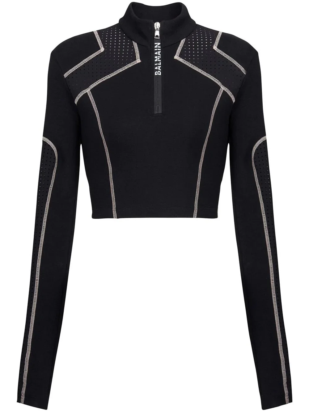 logo-print cropped top black/white perforated detailing contrast stitching mock neck short front zip fastening long sleeves straight hem cropped Imported Composition Cotton 95%, Spandex/Elastane 5%