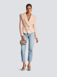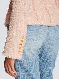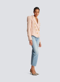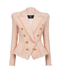 Double-breasted tweed jacket - Fitted cut, nipped in waist - Darts on the front - Tailored neckline with pointed lapels - Structured shoulders, long sleeves - Suit-style cuffs, 5 golden metal “Signature Chain” buttons - Fastening with 8 “Signature Chain” golden metal buttons (7 of which are decorative) - 1 breast pocket - Model measures 179cm and wears a size 36 - Main material: 79% polyamide 15% virgin wool 6% cotton - Made in Slovakia - Item: CF1SI206XF91