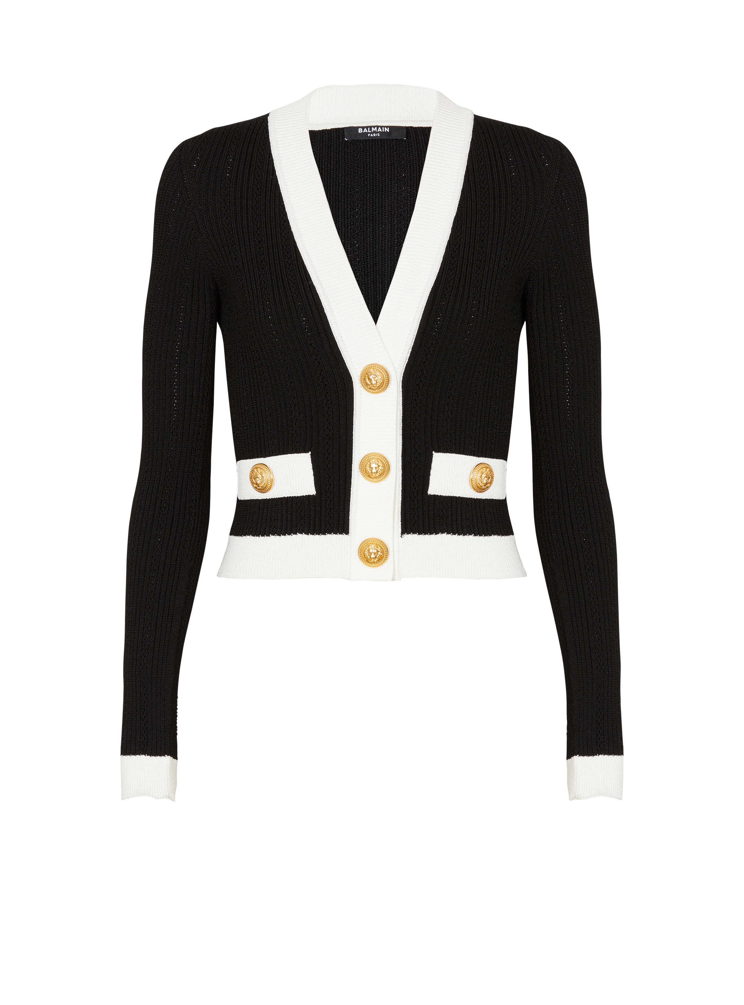 Knit cardigan - Cropped, tight fit - Openwork knit - Long sleeves - Deep V-neckline - Fastening with 3 decorative "Lion Head" press studs in gold metal - 2 fake pockets with decorative gold metal "Lion Head" buttons - Contrasting ribbed edging - Model measures 179cm and wears a size 36 - Main material: 84% viscose 16% polyester - Made in Italy - Item: CF0KL018KF24100% of the viscose fibers in this garment come from sustainably managed forests and certified