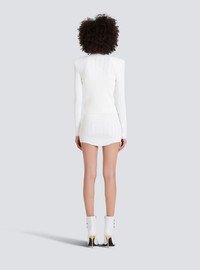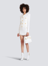 Knit cardigan with gold buttons - Long sleeves - Structured shoulders - Ribbed cuffs and hem - Textured knit - Four flap pockets with buttons - Gold embossed buttons - Tight fit - True to size (select your usual size) - The model is wearing a size FR 36 - The model’s height is 177 cm - Material: 83% viscose, 17% polyamide - Made in Italy - Item: AF1KL005KB39