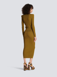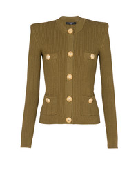 Knit cardigan with gold buttons Long sleeves, structured shoulders, ribbed cuffs and hem, textured knit, four flap pockets with buttons, gold embossed buttons Tight fit True to size (select your usual size) The model is wearing a size FR 36 The model’s height is 177 cm/5 ft 9 1/2 in, bust 80 cm/31.5 in, waist 60 cm/23.5 in and hips 88 cm/34.5 in Made in Italy Material: 83% viscose, 17% polyamide Item: AF1KL005KB39