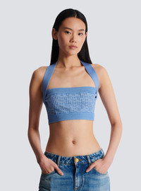 Sparkly knit halterneck top with PB Labyrinth monogram - Square neckline - Fastening at the neck with 4 "Double Chain Lion" press studs - Visible metal zip fastening on the back with Balmain-engraved slider - Gold hardware - Ribbed trim - Cropped slim fit - Model measures 179cm and wears a size 36 - Main material: 78% viscose 17% metallic polyester 5% polyester - Made in France - Item: EF1AA025KI02