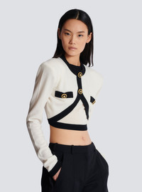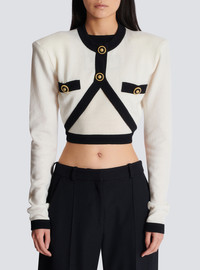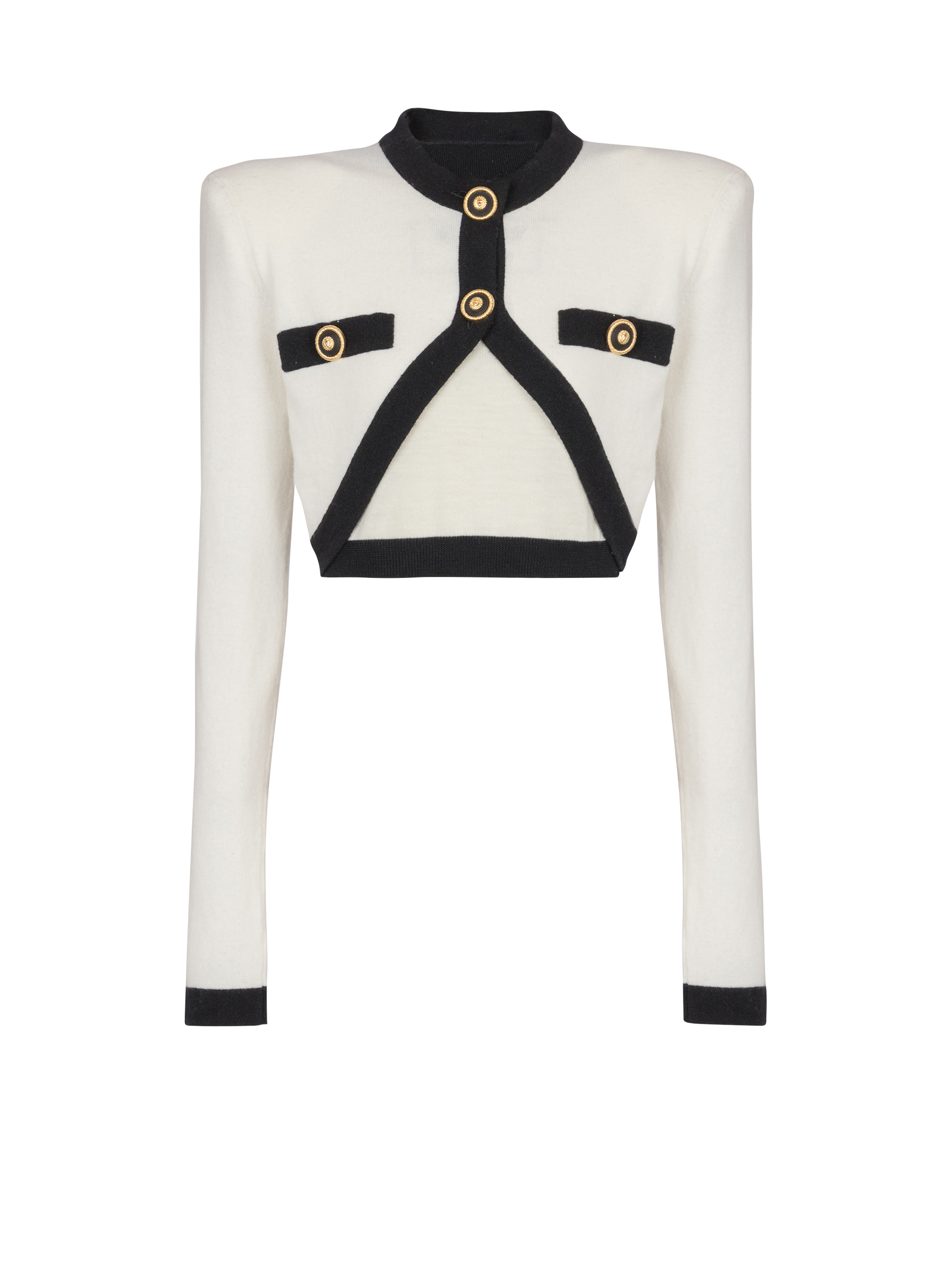Two-tone knit jumper with faux cardigan design - Round-neck cardigan - Fastening with 2 press studs - Round-neck jumper - Structured shoulders - Long sleeves - 2 fake pockets with buttons - "Chain Lion Thread" buttons in two-tone metal - Contrasting ribbed edging - Cropped slim fit - Model measures 179cm and wears a size 36 - Main material: 55% wool 24% cashmere 21% virgin wool - Made in Italy - Item: EF1KA120KH91