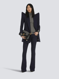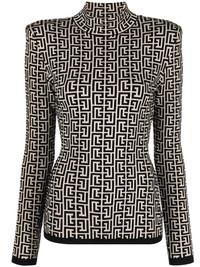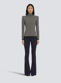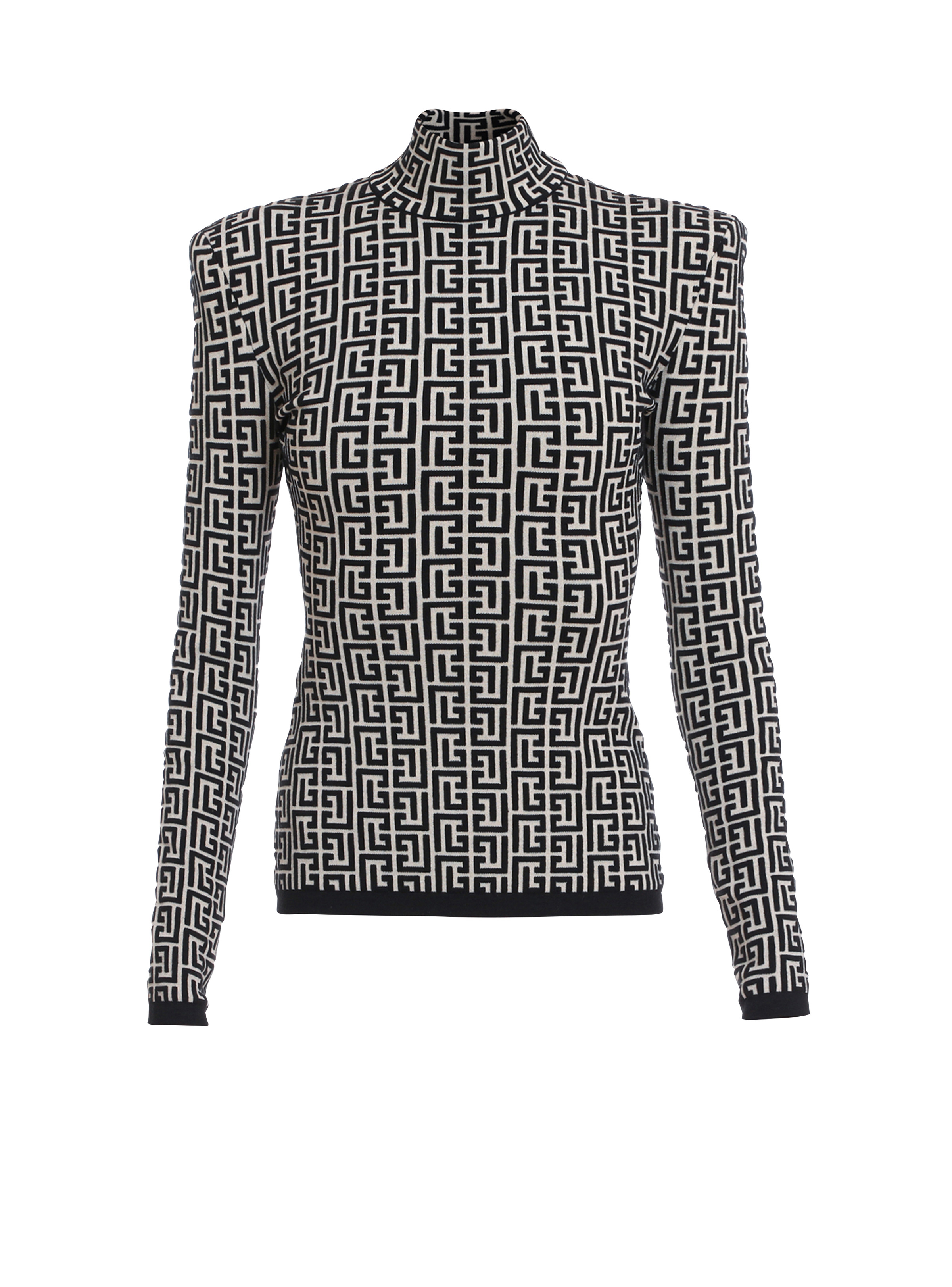 Knit sweater Balmain monogram, turtleneck, long sleeves, structured shouldersFitted cut Fits true to size, select your usual size The model is wearing FR size 36 The model's height is 177 cm / 5 ft 9.5 in, bust 80 cm / 31.5 in, waist 60 cm / 23.5 in, hips 88 cm / 34.5 in Made in Italy Materials: 48% Wool, 31% Viscose, 19% Polyamide, 2% Elastane Item: YF1KF000KB02