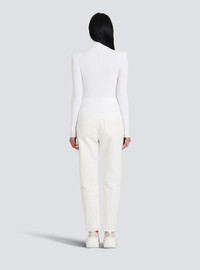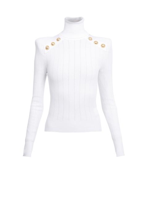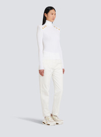 Knit sweater - Turtleneck - long sleeves - structured shoulders - embossed gold-tone buttons - ribbing - Fitted cut - Fits true to size - select your usual size - The model is wearing FR size 36 - The model's height is 177 cm - Materials: 83% Viscose, 17% Polyester - Made in Portugal - Item: YF1KH000KB00