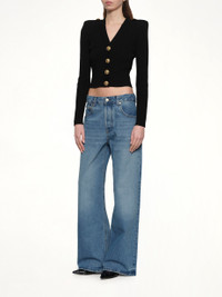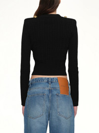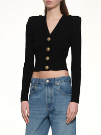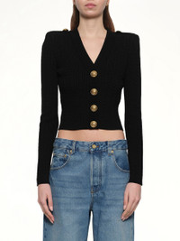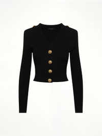 Balmain's LS Buttoned V-Neck Torsade Knit Cardigan in Black is a sophisticated addition to any wardrobe. This elegant piece combines classic design with modern detailing for a timeless look. - Composition: 83% Viscose 17% Polyester - Features a V-neckline with button closure - Intricate torsade knit pattern - Long sleeves for added warmth - Versatile black color for easy pairing - Designed for a tailored fit - Made in France Model is 178 cm and wears size 36 SKU: KL245KI50 0PA
