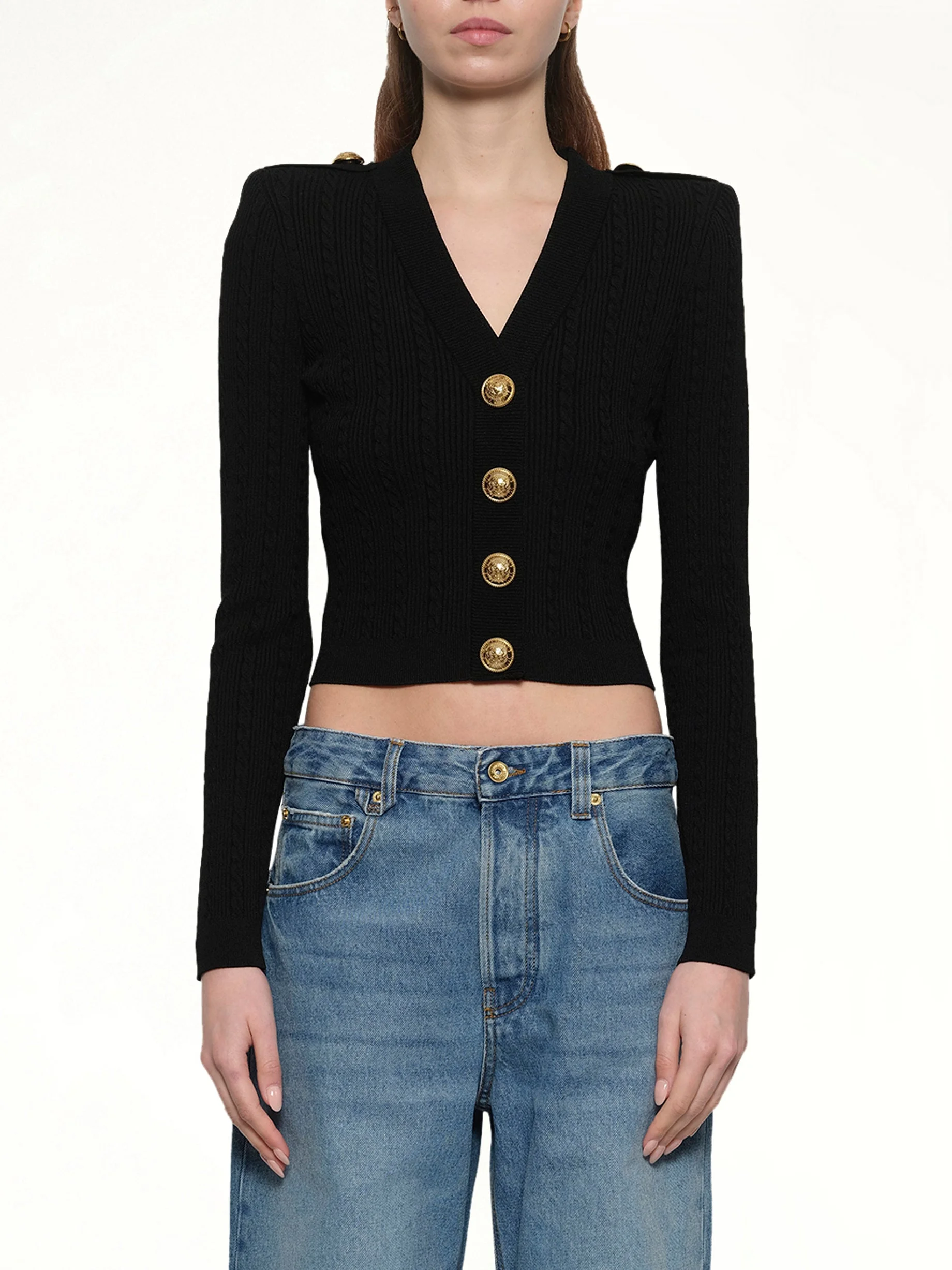 LS Buttoned V-Neck Torsade Knit Cardigan in Black