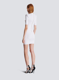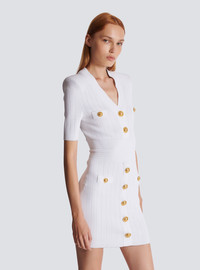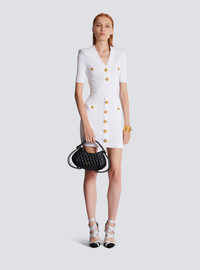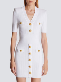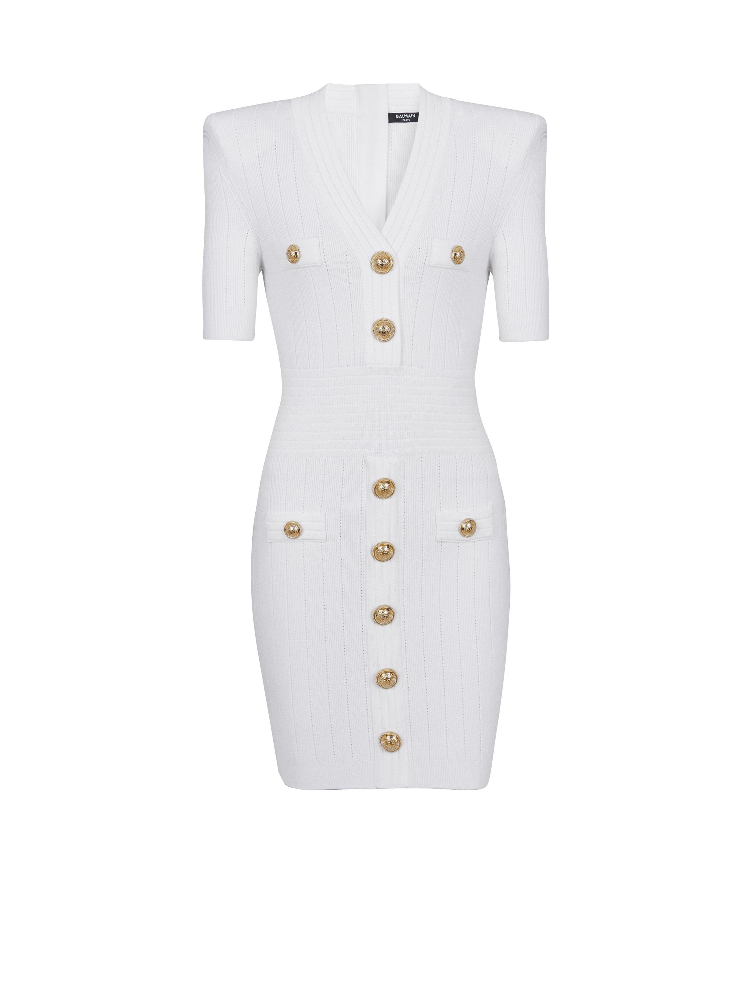 Fine ribbed knit dress - Short, tight fit - Scoop V-neckline - Structured shoulders - Trompe-l'oeil button fastening - Trompe-l'oeil chest pockets and side pockets with buttons - Signature gold "crest" engraved buttons - Zip fastening at the back, visible XL gold zip - Short sleeves, ribbed trim - Model measures 175cm and wears a size 36 - Main material: 83% viscose, 17% polyester - Made in Italy - Item: EF1R6045KB07 100% of the viscose fibers in this garment come from sustainably managed forests and certified