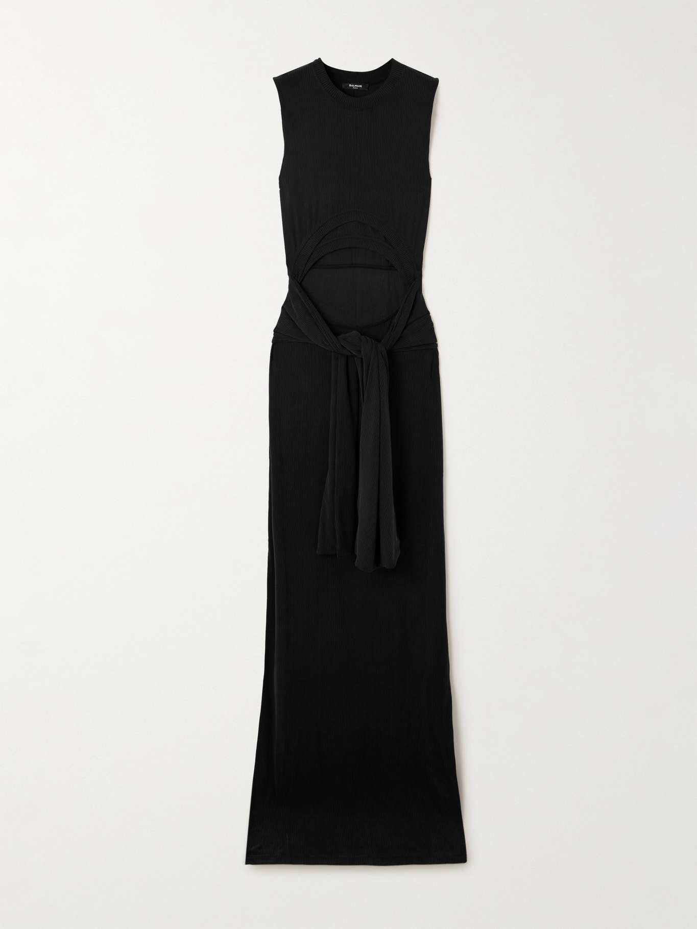 EDITORS'NOTES Balmain's Resort '25 collection puts an unexpected twist on classic silhouettes. Defined by the midriff-baring cutout, this maxi dress is rib-knitted to skim your figure and has a knotted sash tie at the hips. Complement the leg-baring slit with your highest heels. SIZE & FIT Model measurements: - Fits true to size, take your normal size - Designed for a slim fit - Lightweight, stretchy fabric - Model is 177cm/ 5'10" and is wearing a size XSmall - Bust: 85cm/ 33.5” - Waist: 65cm/ 25.5” - Hip: 91cm/ 36” DETAILS & CARE - Black ribbed-jersey - Slips on - 96% cupro, 4% elastane; trim: 93% cupro, 7% elastane - Dry clean