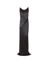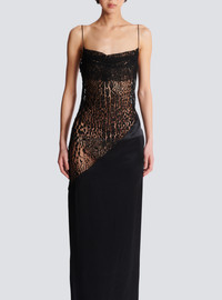 Flowing leopard pattern lace and satin dress - Thin straps - Cowl neckline - Invisible side zip fastening - Semi-sheer leopard pattern lace bodice - Plain satin skirt - Back vent - Long, slim fit - Model measures 179cm and wears a size 36 - Main material: 100% silk - Made in France - Item: FF1RN152MH30100% of this item’s silk fibres are certified and produced by silkworms
