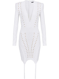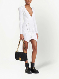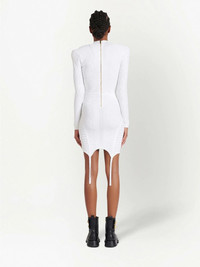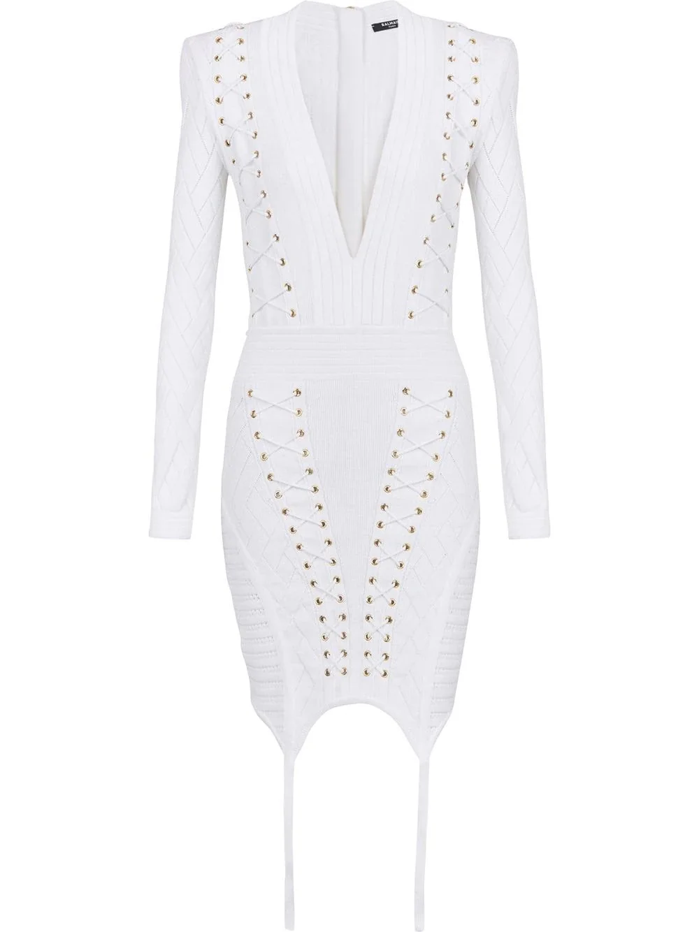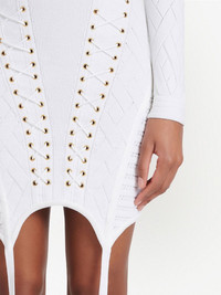 lace-up detail knitted dress white plunging V-neck fine ribbed asymmetric hem shoulder pads long sleeves rear zip fastening Made in Italy Composition Polyester 100%