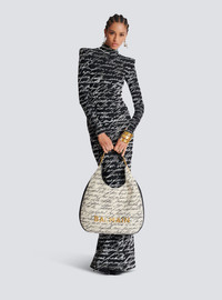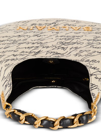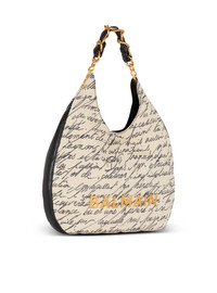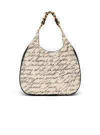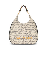 Large 1945 Soft Hobo tote bag in printed "Love Letter" canvas - Carry in the hand or wear on the shoulder - Metal Balmain logo - Chain handle interlaced with leather - Metal side plaques with engraved B buttons - Leather side gusset - Magnetic clasp - Twill lining - Inside zipped pocket - Inside patch pocket - Embossed leather card pocket - Gold hardware - Dimensions: 5.5 x 45.5 x 38 cm - Main material: 58% cotton 42% linen - Made in Italy - Item: EN1BT929TEPM