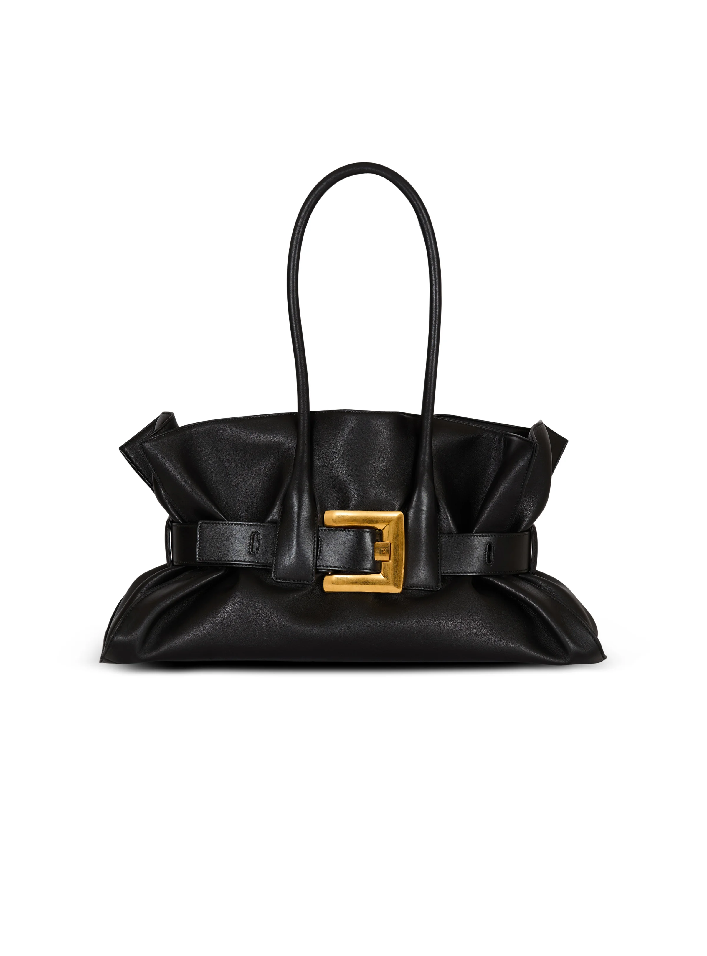 Large calfskin Anthem bag - Soft belted style - Carry in the hand or wear on the shoulder - Leather handle - Smooth leather belt and belt loops - Leather and PB-engraved metal buckle - Metal PB logo on the back - Magnetic fastening - Inside zipped pocket - Embossed leather inside card pocket - Gold hardware - Dimensions: 56 x 30 x 20 cm - Main material: 100% calfskin - Made in Italy - Item: GN1DB991LSAX
