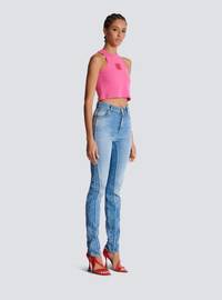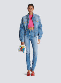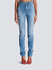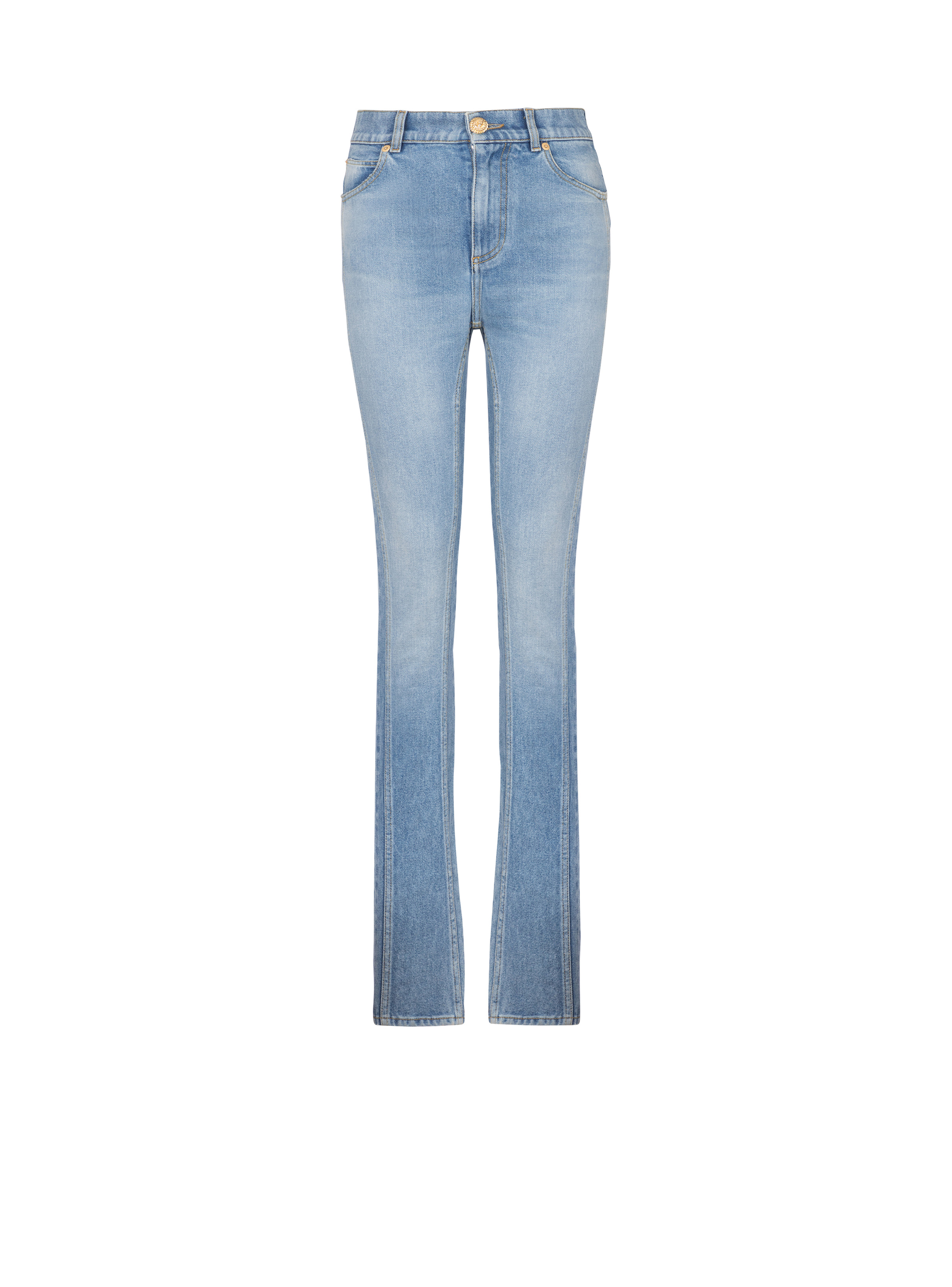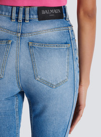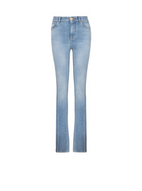 Light blue denim slim-fit jeans - Skinny fit - 5 classic pockets - Zip fastening with a metal "Double Chain Lion" button - Engraved metal rivets - Waistband with belt loops and a triple belt loop at the back - Woven label with vintage Balmain logo - Gold hardware - Light blue wash - Model measures 179cm and wears a size 36 - Main material: 98% cotton 2% elastane - Made in Italy - Item: DF1MF041DE53