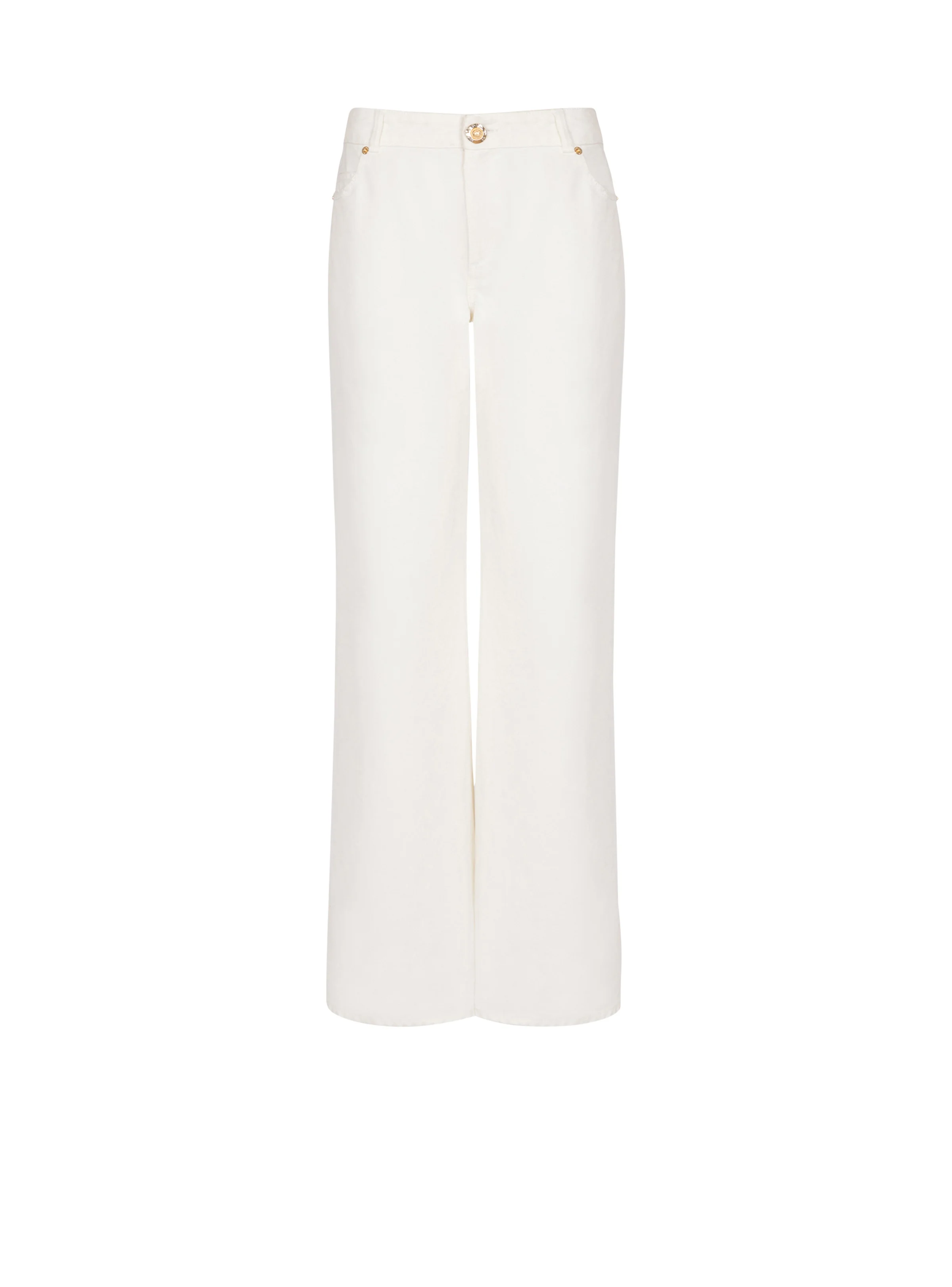 Plain denim jeans - Waistband with belt loops and a triple belt loop at the back - “Gold and Gold Coin” metal button fastening with zip and fly - 5 classic pockets - Woven Balmain Vintage label on the back - Engraved rivets - Gold hardware - Worn-effect finish - Straight cut - Model measures 179cm and wears a size 36 - Main material: 100% cotton - Made in Romania - Item: FF1MI050DF78