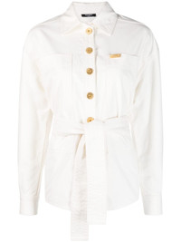 logo-plaque denim shirt jacket Balmain's take on the shirt jacket is punctuated by gold-tone hardware: engraved buttons line the front, matching the logo plaque at the chest. It's cut from white denim and comes with a self-tie belt that can be used to adjust the silhouette. Highlights - White - Cotton - Classic collar - Embossed gold-tone buttons - Two chest patch pockets - Logo plaque - Self-tie fastening - Long sleeves - Two front patch pockets - Buttoned cuffs - Straight hem Made in Italy Composition Cotton 100% SIZE & FIT Model measurements Height 5 ft 10 in(1.79 m) Bust/Chest 31.1 in(79 cm) Hips 35.03 in(89 cm) Waist 24.01 in(61 cm) FittingInformation Designed to be unstructured, offering a loose fit throughout The tie fastening gives an adaptable and personalised fit Made from a midweight non-stretch fabric This piece fits true to size – take your usual size Washing instructions Hand Wash