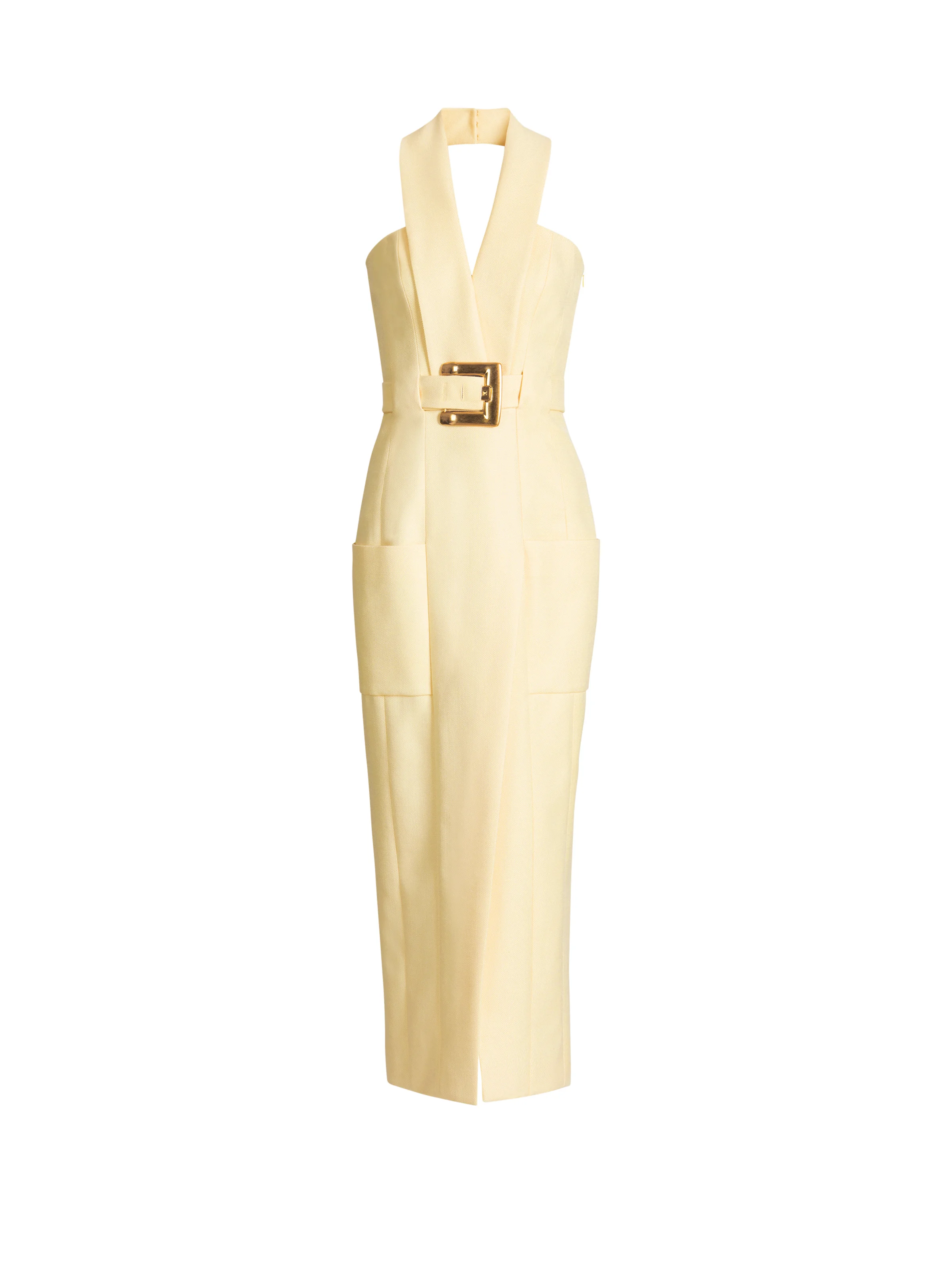 Long crepe halterneck dress - Deep V-shaped halter neckline - Waist belt with Anthem buckle - Side patch pockets and invisible side zip - Fitted cut - Front vent - Model measures 180cm and wears a size 36 - Main material: 100% viscose - Made in France - Item: GF1RJ215VI58100% of the viscose fibres used to make this garment come from certified, sustainably managed forests