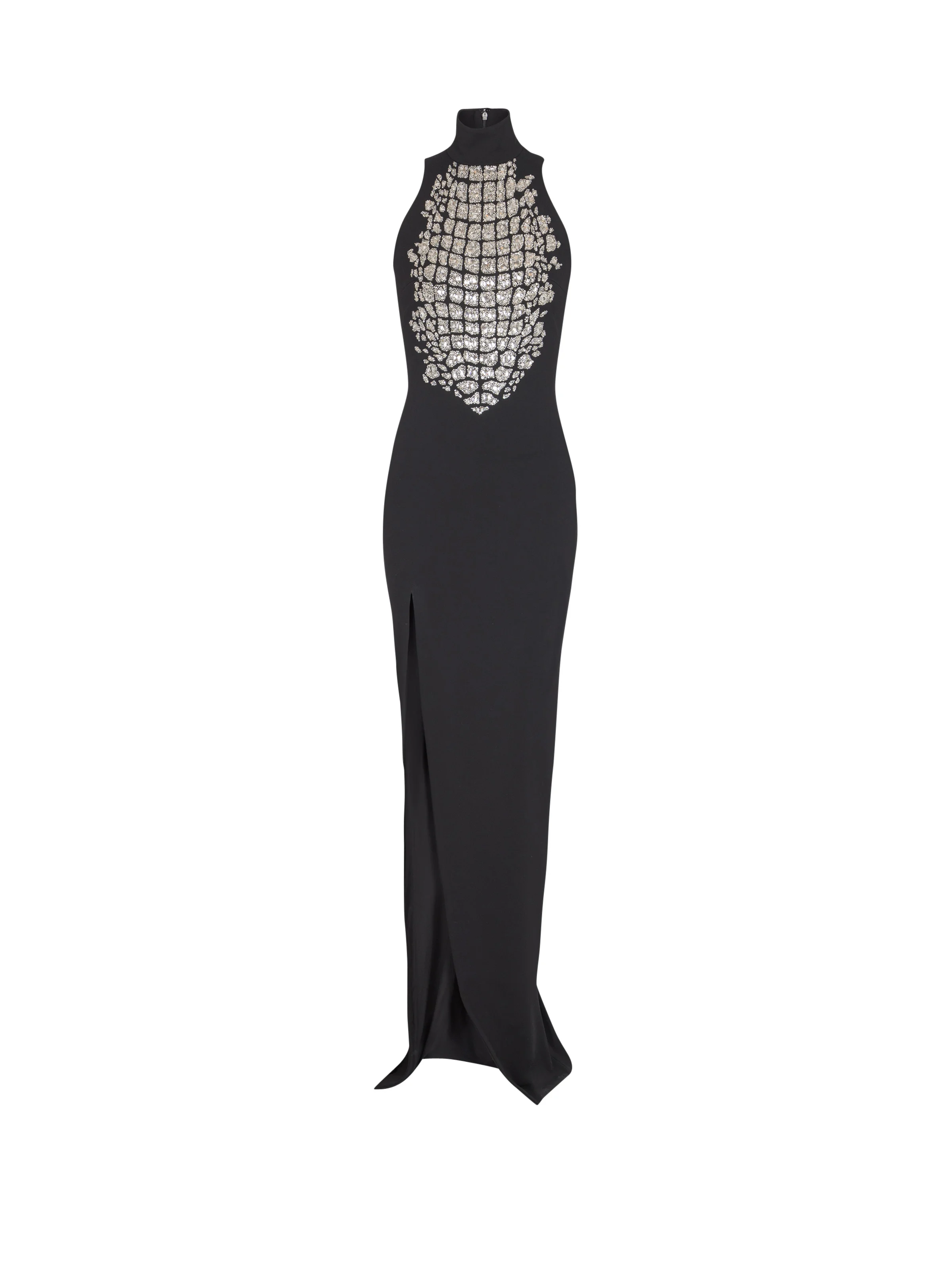 Long slit halterneck dress - Bodice embroidered with beads and stones in a crocodile design - High neck - Invisible zip fastening on the back with Balmain Paris-engraved slider - Front slit - Lined - Fitted cut - Model measures 180cm and wears a size 36 - Main material: 75% viscose 17% polyamide 8% elastane - Made in India - Item: FF0RP001PD24