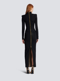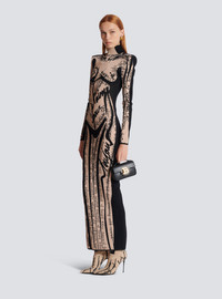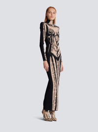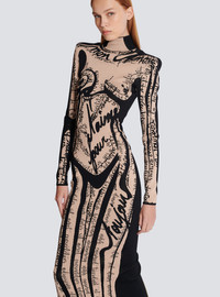 Jacquard knit dress with body motif - Long, slim fit - High neck - Structured shoulders - Long sleeves - Visible gold metal double zip fastening on the back with Balmain Paris-engraved sliders - Ribbed trim - Model measures 181cm and wears a size 36 - Main material: 97% viscose 3% polyamide - Made in France - Item: EF1RR269KH95100% of the viscose fibres used to make this garment come from certified, sustainably managed forests