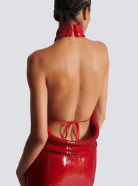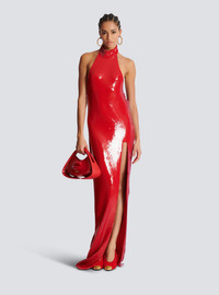 Long sequin halterneck dress - High neck - Front split - Invisible side zip fastening - Neck fastening with hooks - Tied at the back - Long, slim fit - Model measures 179cm and wears a size 36 - Main material: 100% polyester - Made in France - Item: EF0RP148XK97