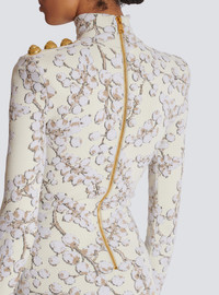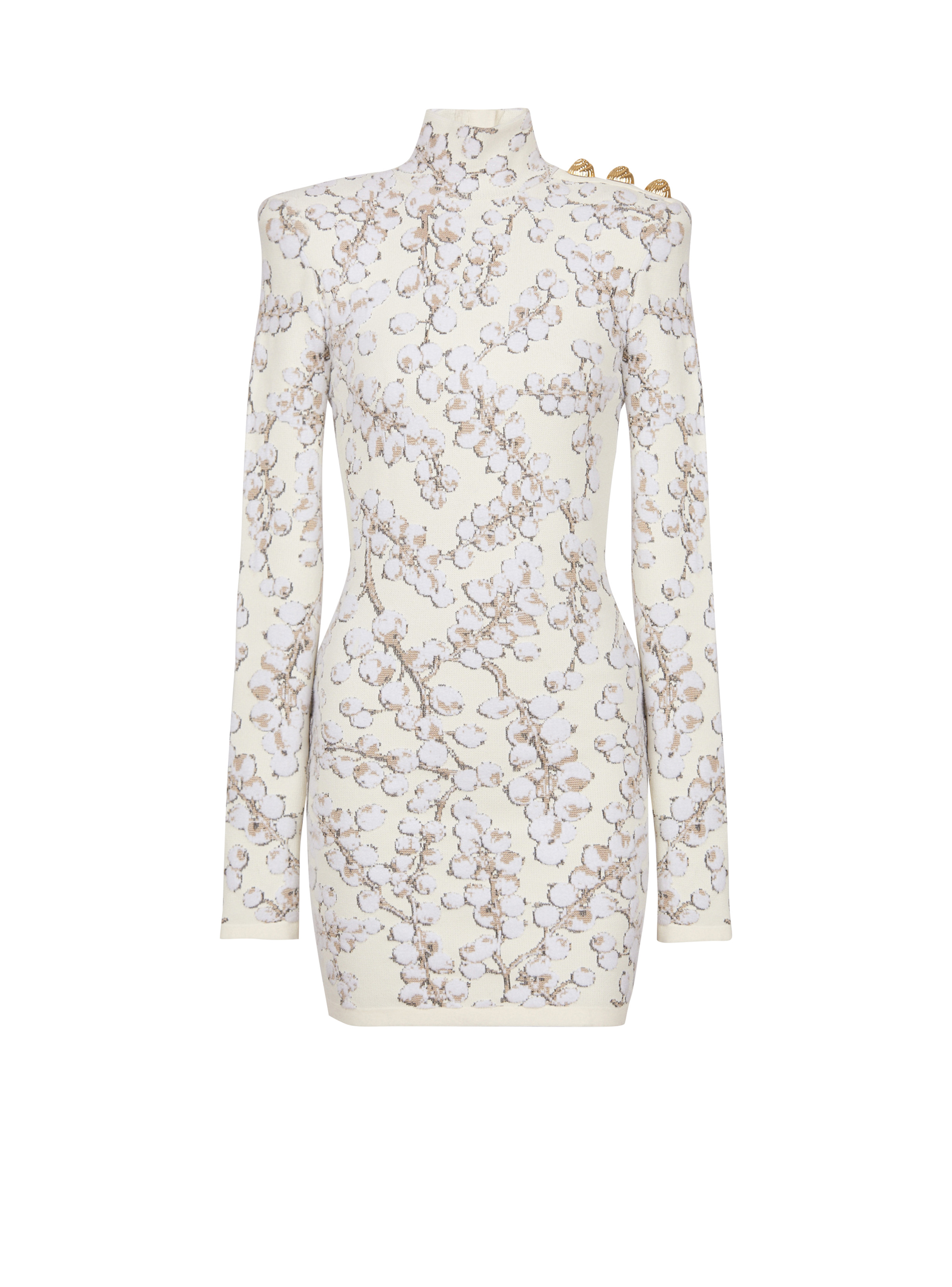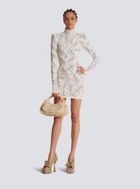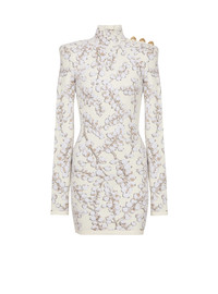Redcurrant jacquard knit short dress - Short fitted cut - High collar - 3 decorative buttons on the shoulder - "Snail" buttons in gold metal - Structured shoulders - Long sleeves - Visible gold metal zip fastening on the back with Balmain-engraved slider - Embossed velvet knit with shiny threads - Ribbed trim - Model measures 179cm and wears a size 36 - Main material: 74% viscose 14% polyamide 9% polyester 3% cupro - Made in Italy - Item: DF0R8018KH62