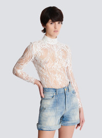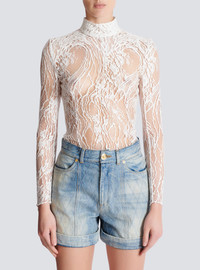 Lace body - High neck - Long sleeves - Invisible zips at the cuffs - Back fastening with invisible zip and hook - Snap fastening at crotch - Fitted cut - Model measures 178cm and wears a size 36 - Main material: 84% cotton 16% polyamide - Made in Portugal - Item: FF1BG515CG07100% of the cotton fibres used to make this garment are certified and organically farmed