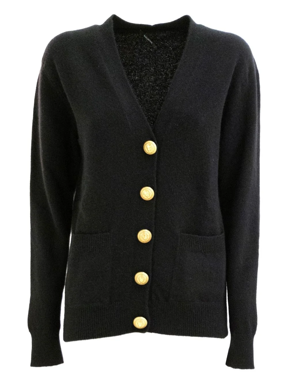 long-sleeves cardigan Highlights - Black - V-neck - Gold-tone buttons - Patch pockets - Long sleeves - Ribbed cuffs Made in France Composition Cashmere 50%, Wool 50% Washing instructions Dry Clean Only