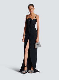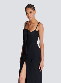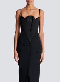 Grain de poudre and satin dress with thin straps - Long, slim fit - Straight cut-out neckline - Jacket effect on the front - Tone-on-tone satin lapels - Woven Balmain Couture label on the front - Double-breasted front with 2 decorative covered buttons - 2 side slash pockets with flaps - Front split - Visible gold metal zip fastening on the back with Balmain Paris-engraved slider - Crepe lining - Model measures 179cm and wears a size 36 - Main material: 100% wool - Made in Slovakia - Item: EF1RN210WC09100% of the wool fibres used to make this garment are sourced from sheep farms that are certified and animal welfare-friendly