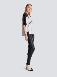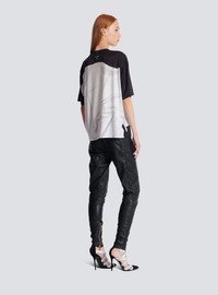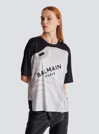 Satin jersey T-shirt with optical illusion print - Round neck with ribbed trim - Short sleeves - Contrasting optical illusion printed on the front and back - Balmain Paris logo integrated into the print - Woven Balmain Couture label on the back - Loose regular fit - Model measures 181cm and wears a size S - Main material: 94% polyester 6% elastane - Made in Italy - Item: EF1EG110GE37
