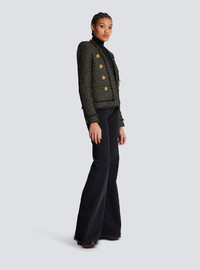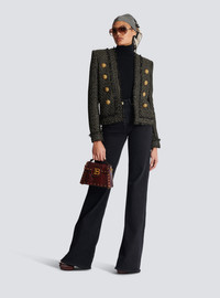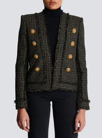 Lurex tweed jacket - Straight cut - Structured shoulders, long sleeves - Collarless V-neckline - 8 decorative golden metal 'Lion Head' buttons - Basic cuffs, 1 golden metal button - Frayed edging - Model measures 176cm and wears a size 36 - Material: 48% viscose, 34% polyester, 13% cotton, 5% polyamide - Made in Poland - Item: BF1SK455VD57